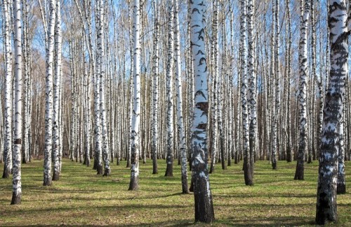 Fototapeta Las sosnowy z ostatniego z słońce świecące przez drzewa.