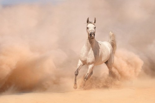 Fototapeta Portret siwego konia wśród kwiatów łubinu.
